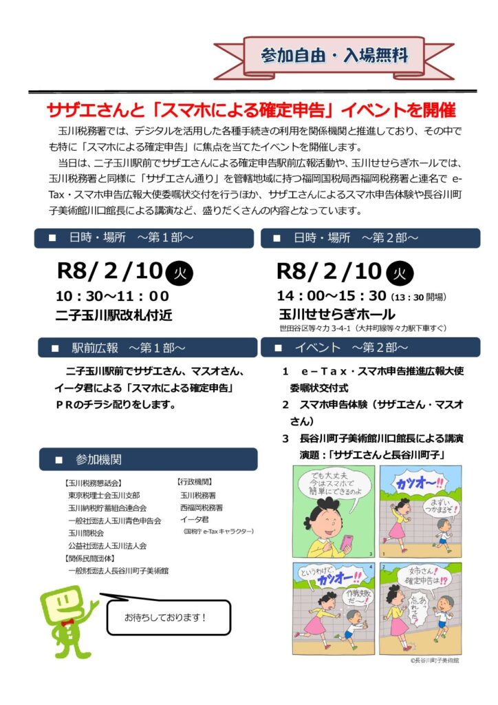 玉川税務署では、デジタルを活用した各種手続きの利用を関係機関と推進しており、その中でも特に「スマホによる確定申告」に焦点を当てたイベントを開催します!家族みなさんでお越しください!