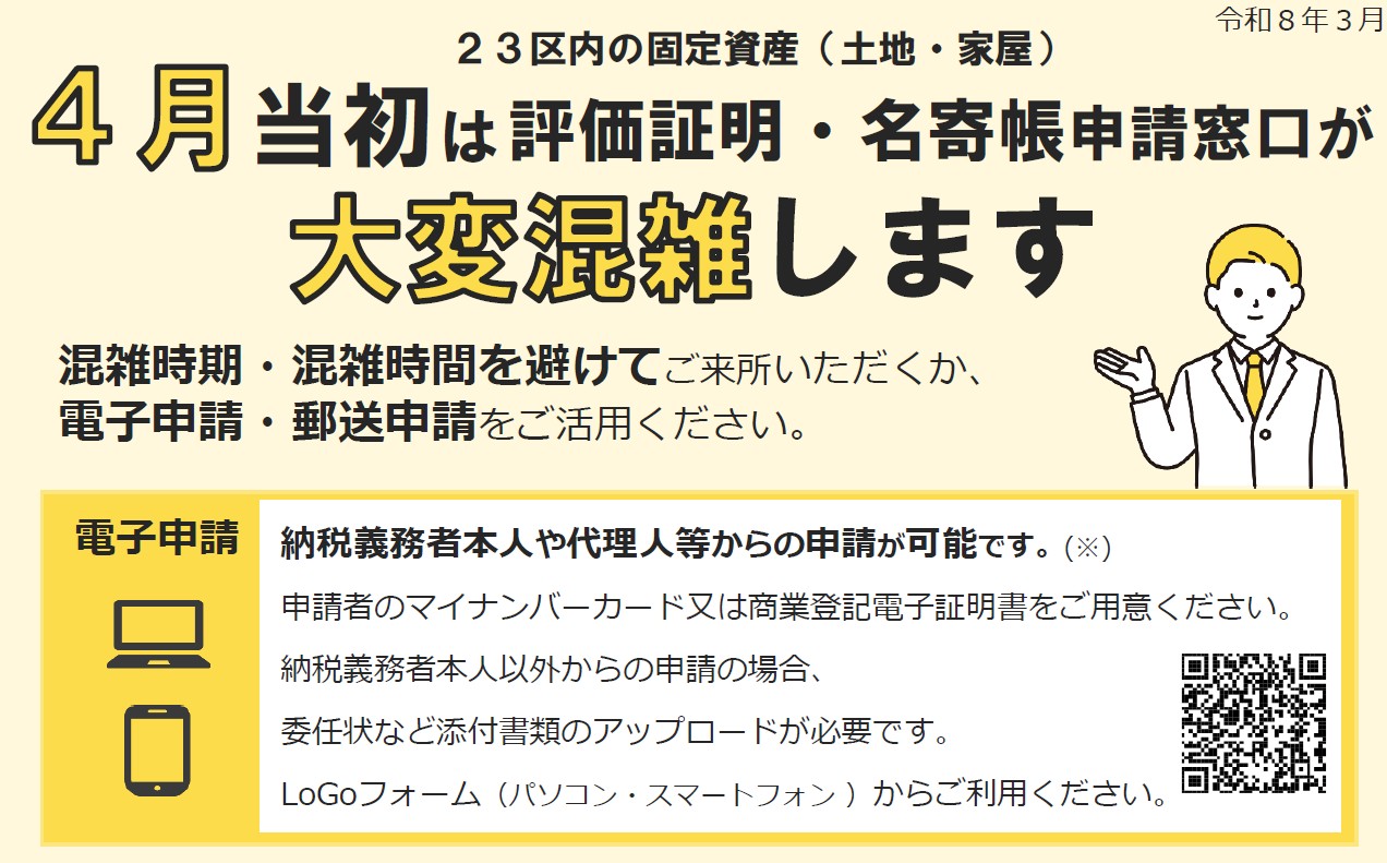 投稿日:2026.03.04 都税事務所窓口混雑緩和に係るお願い~4月当初は大変混在します~ 23区内の固定資産(土地・家屋)4月当初は 評価証明・名寄帳申請窓口が大変混雑します。 混雑時期、混雑時間を避けてご来所いただくか、電子申請・郵送申請をご活用ください。 【別紙チラシ】はこちらよりPDFをダウンロードしてご覧ください