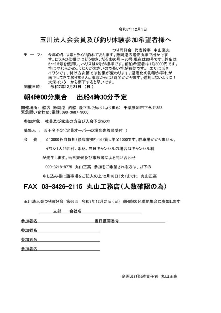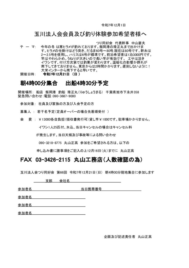 会員のみ つり同好会 詳細はこちらから 今年の冬 は寒ヒラメが釣れております。飯岡港の隆正丸まで出かけます。 日 時: 令和7年12月21日(日) 4:00 主 催: つり同好会 場 所: 船店 飯岡港 釣船 隆正丸(りゅうしょうまる) 千葉県旭市下永井358 参加費: ¥13000各自負担(領収書発行可)貸し竿¥1000です。駐車場かかりません。 お申し込みはメールもしくは下記参加お申込みボタンから※人数に制限があるものもございますのでお早めにお申し込みください。 参加お申し込み Page Top