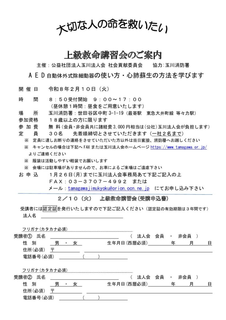 どなたでも 上級救命講習会 詳細PDFはこちらから AEDの使い方、心肺蘇生の方法を学びます。 参加資格:18歳以上 定員:30名 先着順にて締め切りといたします(1社2名まで) 日 時: 令和8年2月10日(火) 9:00 ~ 17:00 主 催: 社会貢献委員会 場 所: 玉川消防署 世田谷区中町3-1-19(最寄り駅 東急大井町線 等々力駅) 参加費: 無料 受付は終了しました。 Page Top