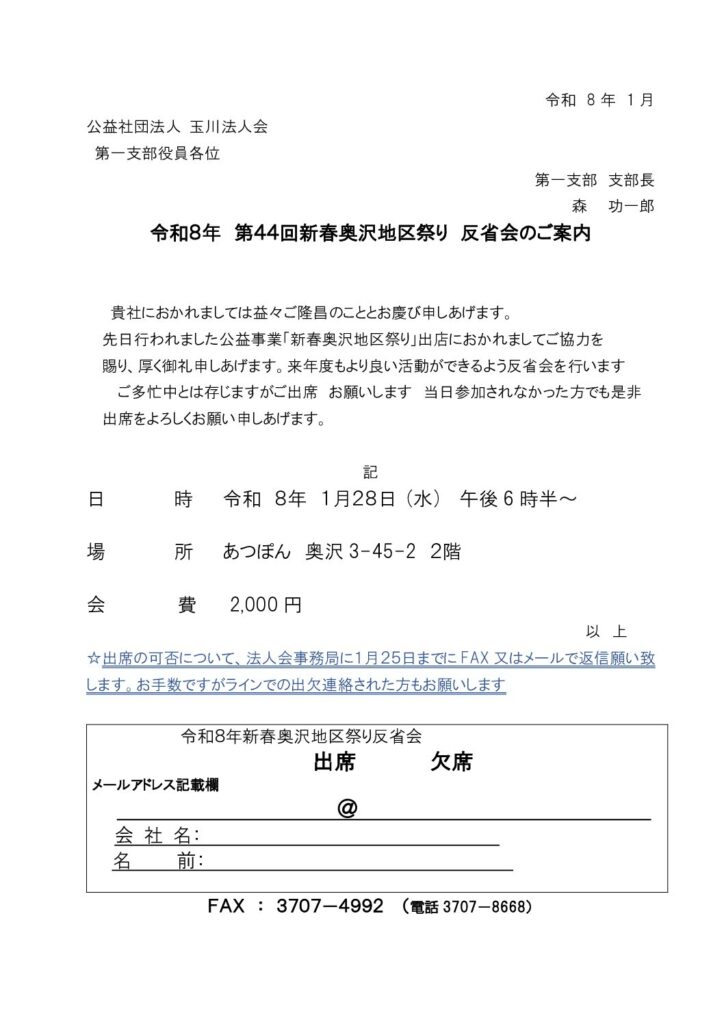 令和8年 第44回新春奥沢地区祭り 反省会 開催のご案内