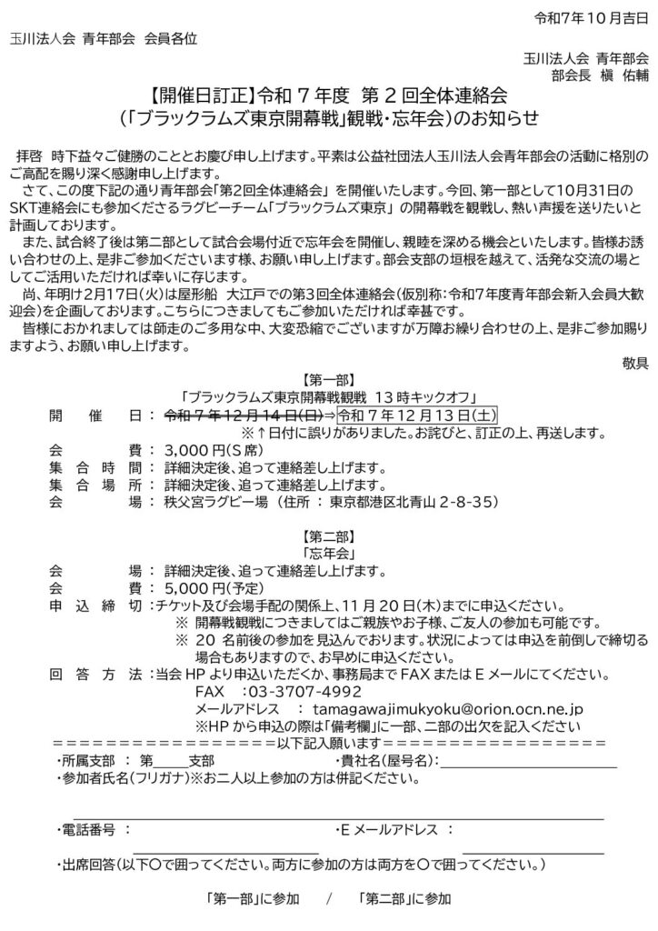 尚、年明けの2月17日(火)は屋形船「大江戸」にて「第3回全体連絡会(仮別称:令和7年度青年部会新入会員大歓迎会)」を計画しております。こちらにつきましてもご参加いただければ幸甚です。