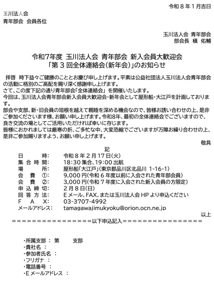 記 日 時: 令和8年2月17日(火) 集 合 時 間: 18:30集合、19:00出航 場 所: 屋形船 大江戸(東京都品川区北品川1-16-1) 会 費①: 9,000円(令和6年度以前に入会された青年部会員) 会 費②: 3,000円(令和7年度に入会された新入会員の方限定) 申 込 締 切: 2月8日(日) 回 答 方 法: Eメール、FAX、または玉川法人会HPより申込ください F A X: 03-3707-4992 メールアドレス: tamagawajimukyoku@orion.ocn.ne.jp 以上