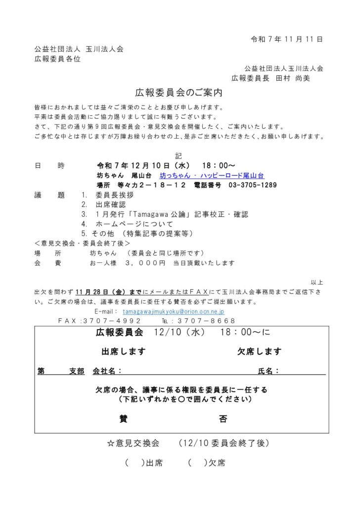 さて、下記の通り第9回広報委員会・意見交換会を開催したく、ご案内いたします。