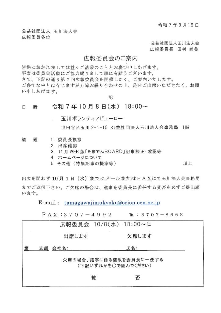 出欠を問わず10月1日(水)までにメールまたはFAXにて玉川法人会事務局までご返信下さい。