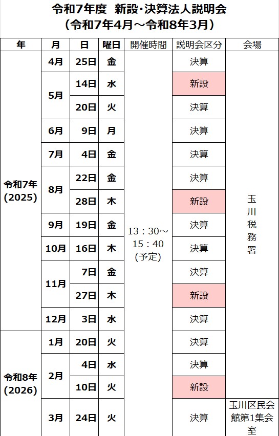 どなたでも 決算法人説明会 ■決算法人説明会とは… 決算を迎える法人のための会社の決算・申告の実務をご説明いたします。 決算を迎えた法人に、適正な法人税の申告をしていただくための手助けとなるよう、決算と申告に関する基本事項を要約しています。 日 時: 令和8年3月24日(火) 13:30 ~ 15:40 主 催: 玉川法人会 講 師: 玉川税務署 場 所: 玉川区民会館 第1集会室 参加費: 無料 お申し込みはメールもしくは下記参加お申込みボタンから※人数に制限があるものもございますのでお早めにお申し込みください。 参加お申し込み Page Top