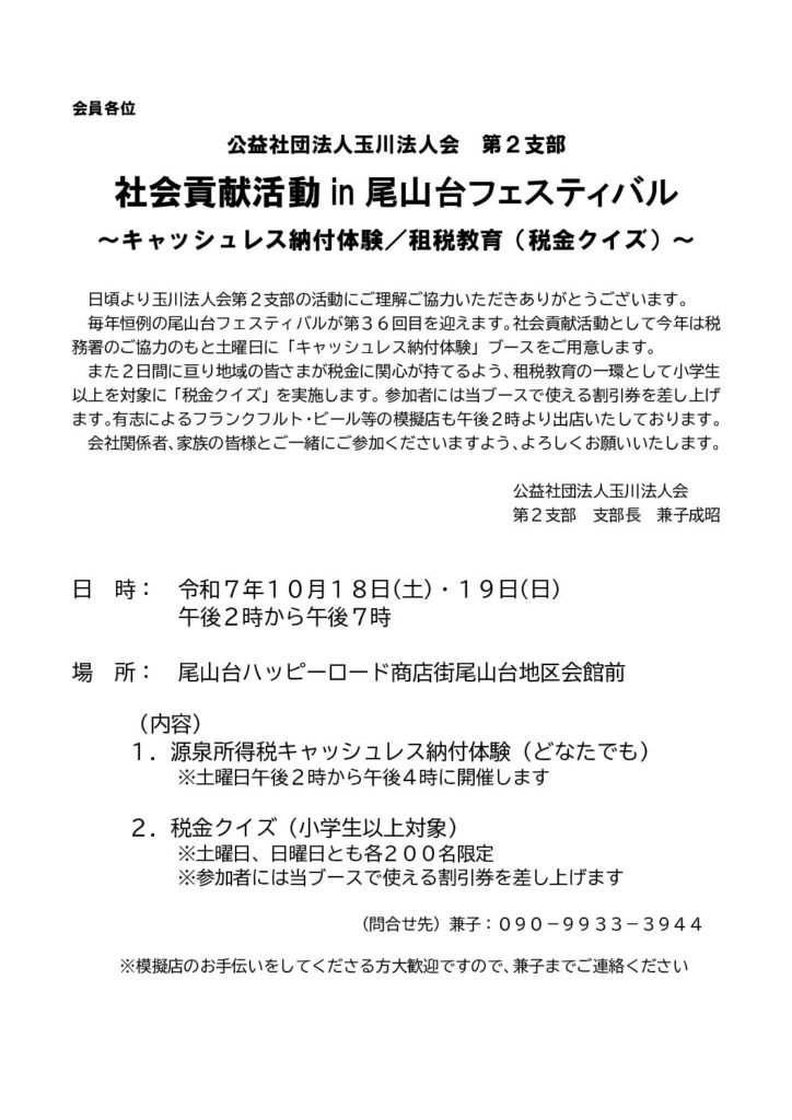 毎年恒例の尾山台フェスティバルが第36回目を迎えます。社会貢献活動として今年は税務署のご協力のもと土曜日に「キャッシュレス納付体験」ブースをご用意します。
