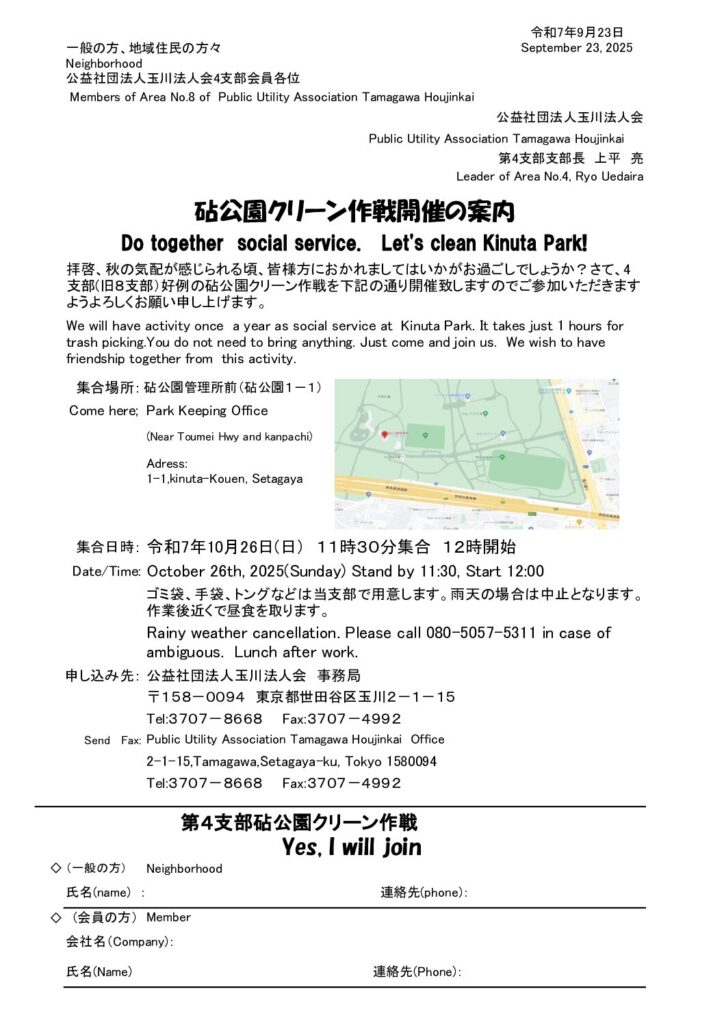拝啓、秋の気配が感じられる頃、皆様方におかれましてはいかがお過ごしでしょうか?さて、4支部(旧8支部)好例の砧公園クリーン作戦を下記の通り開催致しますのでご参加いただきますようよろしくお願い申し上げます。