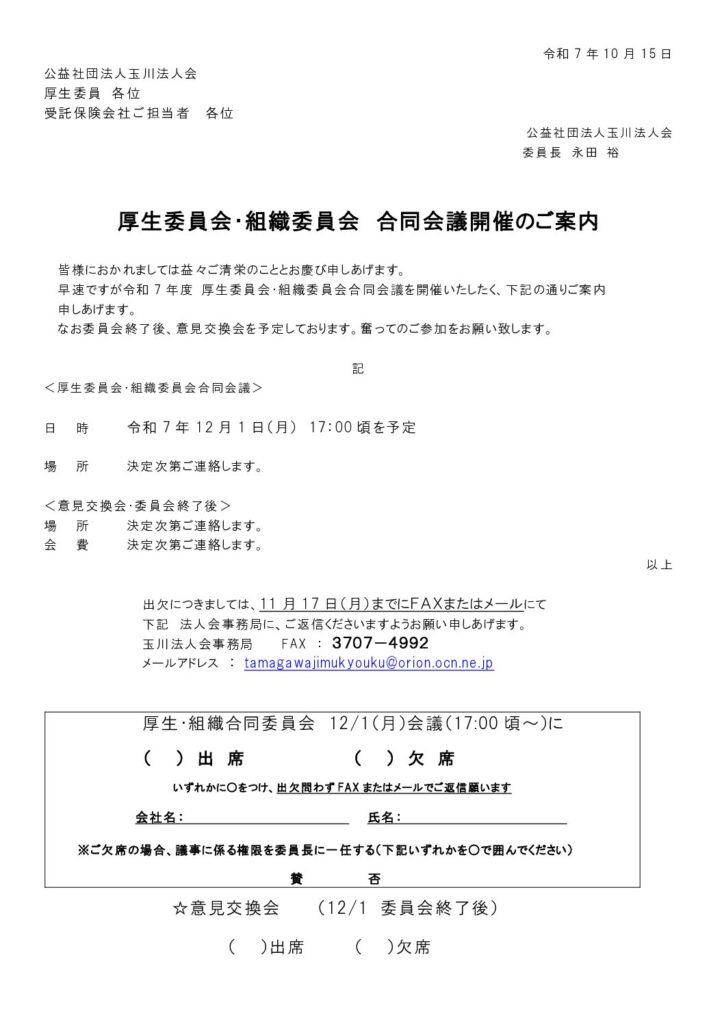 組織委員会・厚生委員会 合同会議開催のご案内