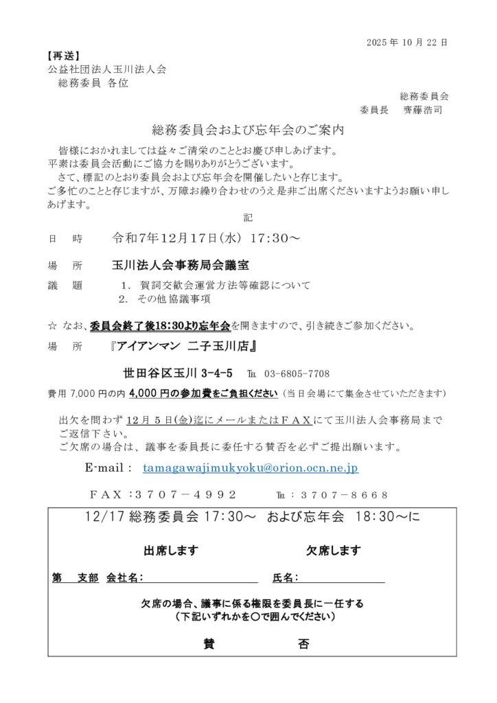 玉川法人会事務局まで、ご返信くださいますようお願いいたします。