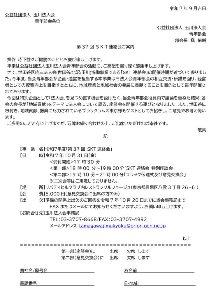 さて、世田谷区内三法人会(世田谷/北沢/玉川)協働事業である「SKT連絡会」の開催時期が近づいて参りました。今年度、当会青年部会が企画・運営を担当する本事業は三法人会青年部会の相互交流・研鑽を図り、経営者としての資質向上を目指すとともに、地域産業と地域社会の発展に貢献することを目的として毎年開催されております。