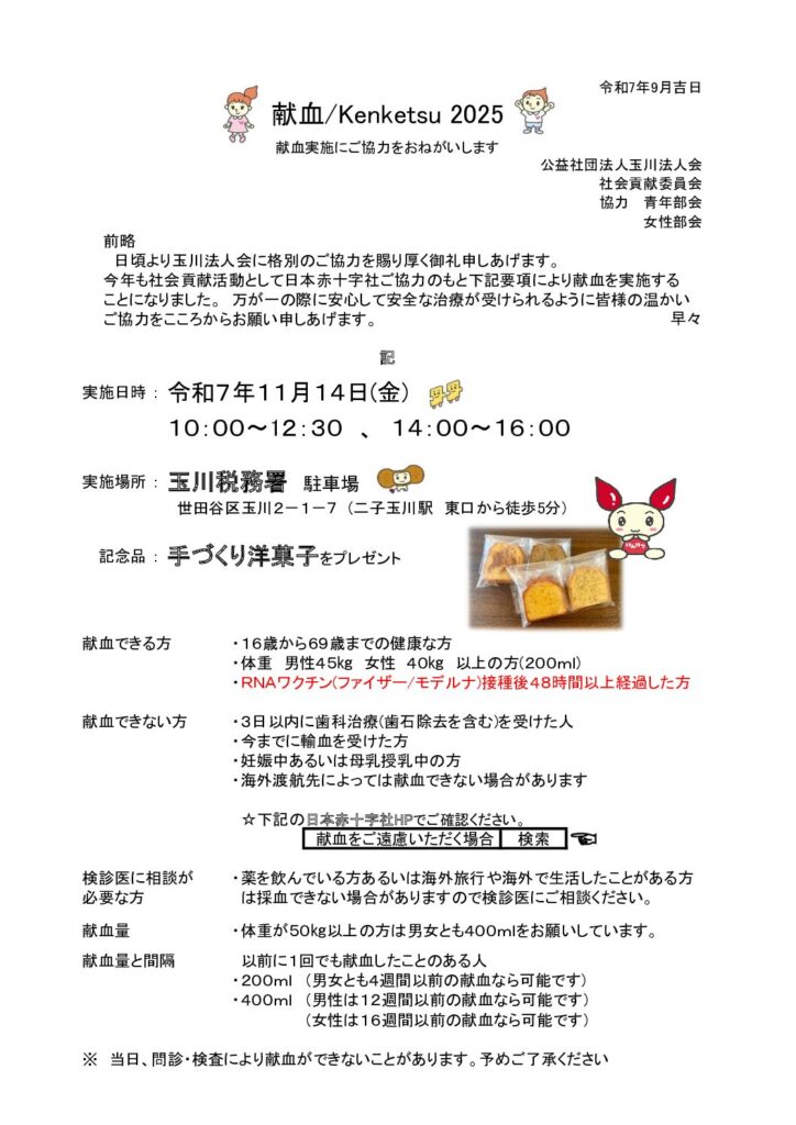 今年も社会貢献活動として日本赤十字社ご協力のもと下記要項により献血を実施することになりました。