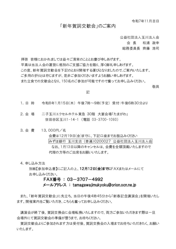 また、「新年賀詞交歓会」に先立ち、当日の午後4時45分から「新春記念講演会」を開催いたします。開催案内をご覧いただき、こちらも奮ってお申し込みください。